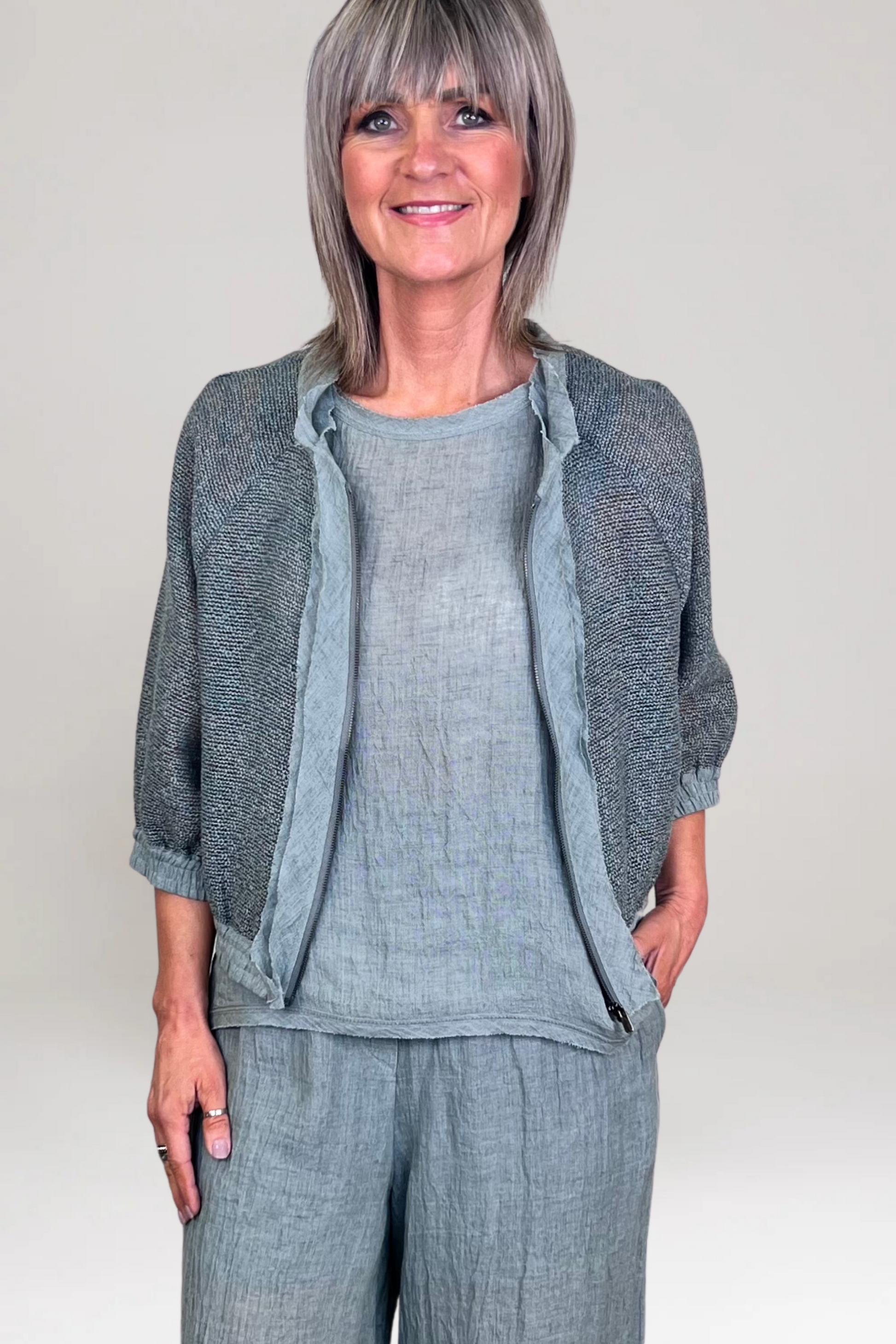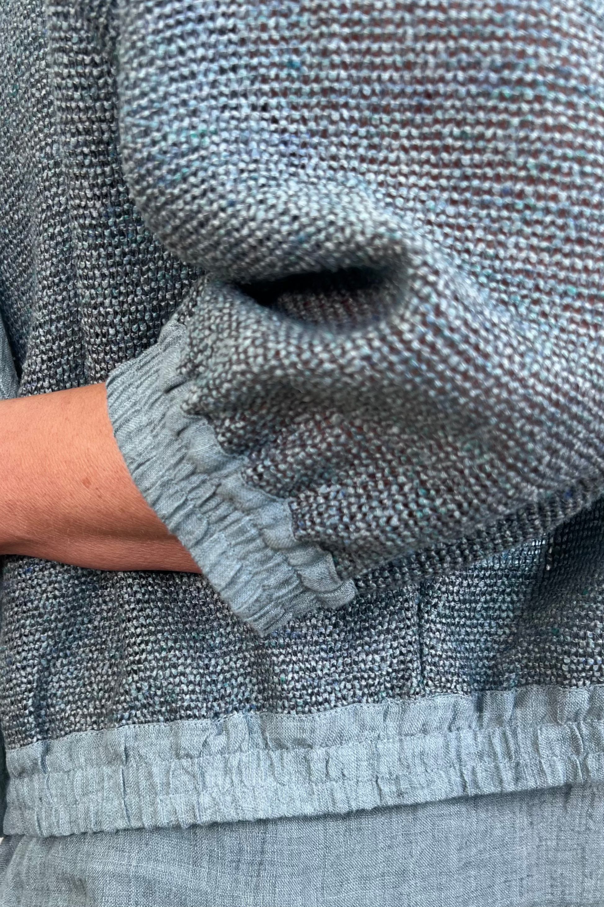 - Linen trim cuffs, waistband & front fastening