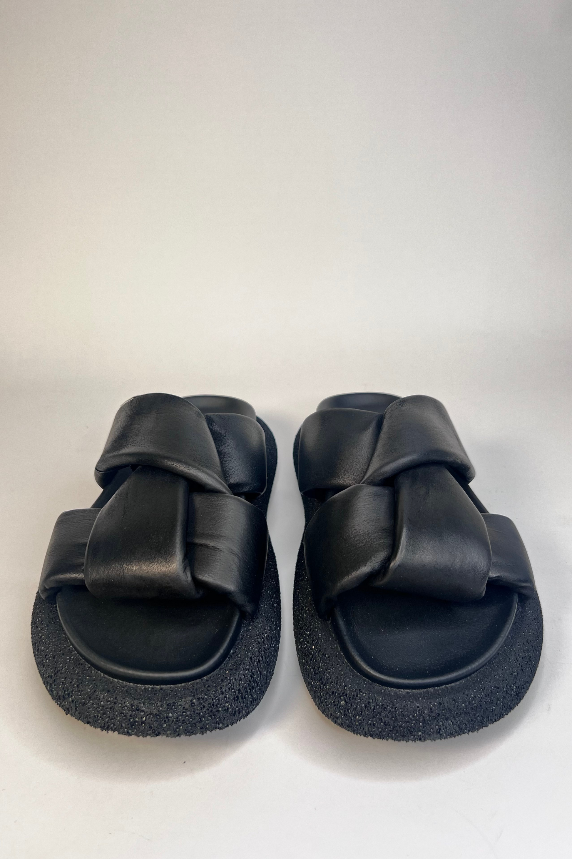Simple and super elegant sandal with twist detailing. The model has a rounded sole that is firm yet surprisingly lightweight.