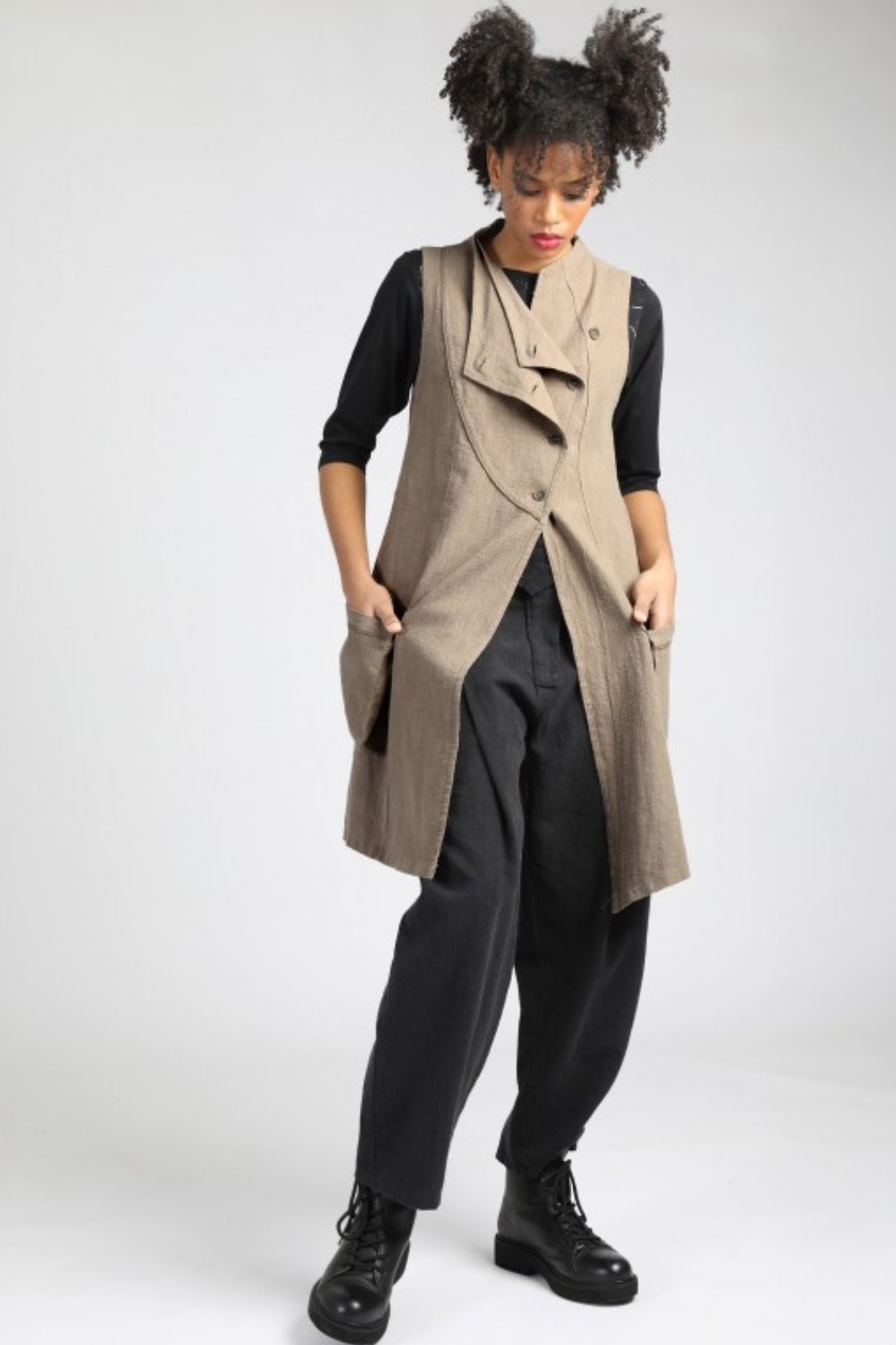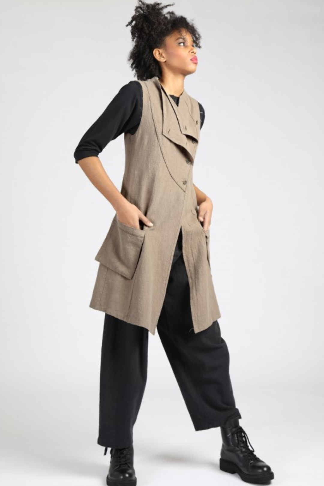 Longline waistcoat with double front panel which allows you to create a layered look. Very flattering shape to be teamed with trousers in the same Ramie fabric or style with jeans and a t-shirt for a more casual look.